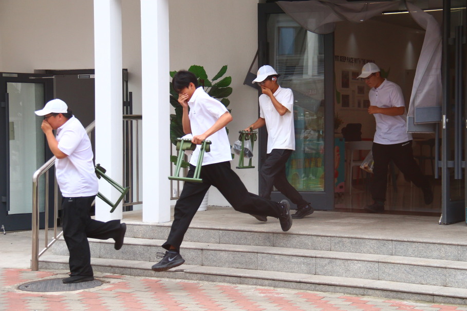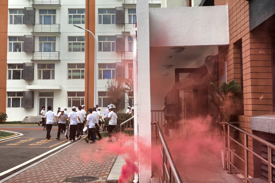 警报响起,应急疏散演练正式开始。师生迅速响应,各部门教师及时到位,指挥学生按预定路线安全、有序撤离。整个过程组织严密、行动高效,未出现拥挤混乱,体现出良好的应急处置能力。消防队员现场开展教学,实物演示灭火器、消防水带等设备的使用方法,讲解火场逃生要领和初期火灾扑救技巧,并指导部分师生实际操作,强化技能体验。